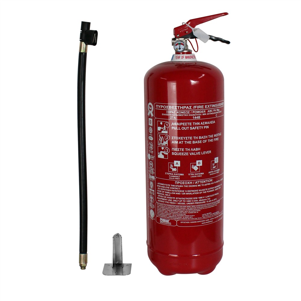 Fire Extinguisher 9Kg Dry Powder ABC 40% with one seam vessel and Pressure Gauge Safety Release Valve. Fire extinguishers with a Class A rating are effective against fires involving paper, wood, textiles, and plastics. Fire extinguishers with a Class B rating are effective against flammable liquid fires. Fire extinguishers with a Class C rating are suitable for fires in “live” electrical equipment.
