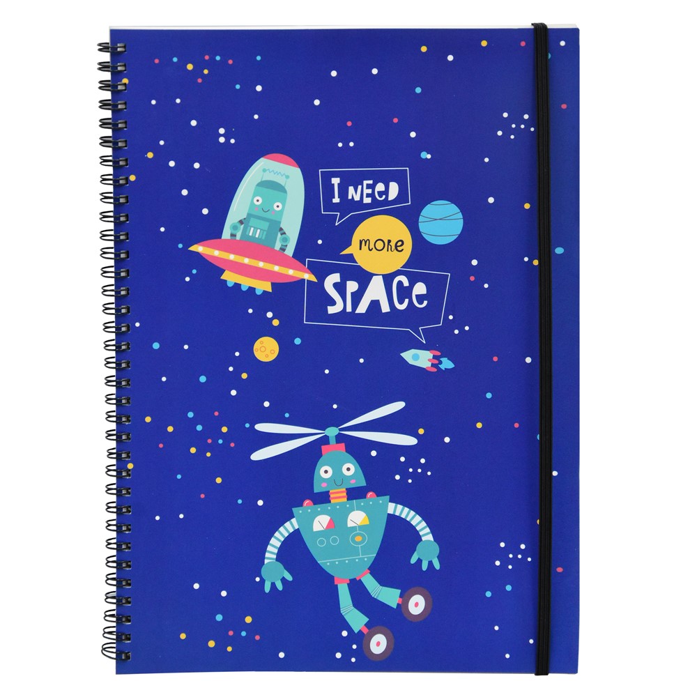 Spiral notebook for children, with elastic band, made of quality paper material, in A4 format, with blue cover with Space design. It is used by children to write, draw and take notes, in schools and home environments. This product is practical and it is suitable for daily use.