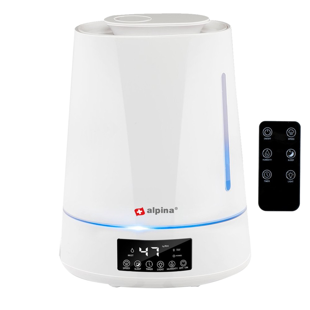 Maintaining good indoor humidity is crucial. This prevents dry skin, lips, and eyes, as well as certain allergies. It's also essential for certain plants and pets. Maintaining the right humidity also helps preserve wooden furniture, floors, and instruments. With the alpina humidifier, you can create a more pleasant living environment. The humidifier features multiple misting settings, a timer from 1 to 12 hours, a fragrance box for aromas, and is easily operated remotely with a remote control. With the alpina humidifier, you can control the humidity level in your home. The humidifier can be adjusted in 5-step increments, ranging from 45% to 90%. Ideally, the humidity level in your home is usually between 40% and 60%. This is especially important during the winter months, as frequent heating can make the air drier. As soon as the integrated hygrometer in the humidifier measures the desired humidity, it automatically stops vaporizing.
