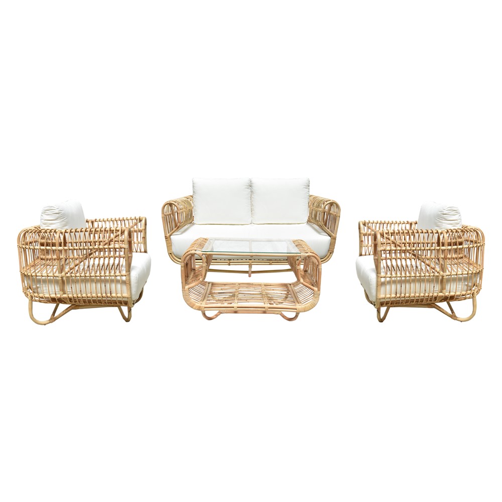 Complete set with 2 single sofas, double sofa and central table. Very special retro style with natural knitting craft. Very comfortable thanks to the seating straps and lightweight construction. You can beautifully decorate outdoor areas such as verandas, green gardens, etc. Very good quality at a cheap price.