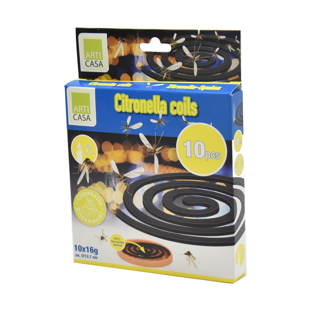 Aromatic mosquito repellent spiral, with dimensions of 13.7 cm in diameter, with a formula enriched with lemon oil and with a burning time of up to 7 hours. It can be used in outdoor environments, such as gardens, balconies, terraces or even in camping trips, to repel insects such as mosquitoes and wasps. It is recommended not to use in closed environments. The package contains 10 pieces, weighing 16 g each.