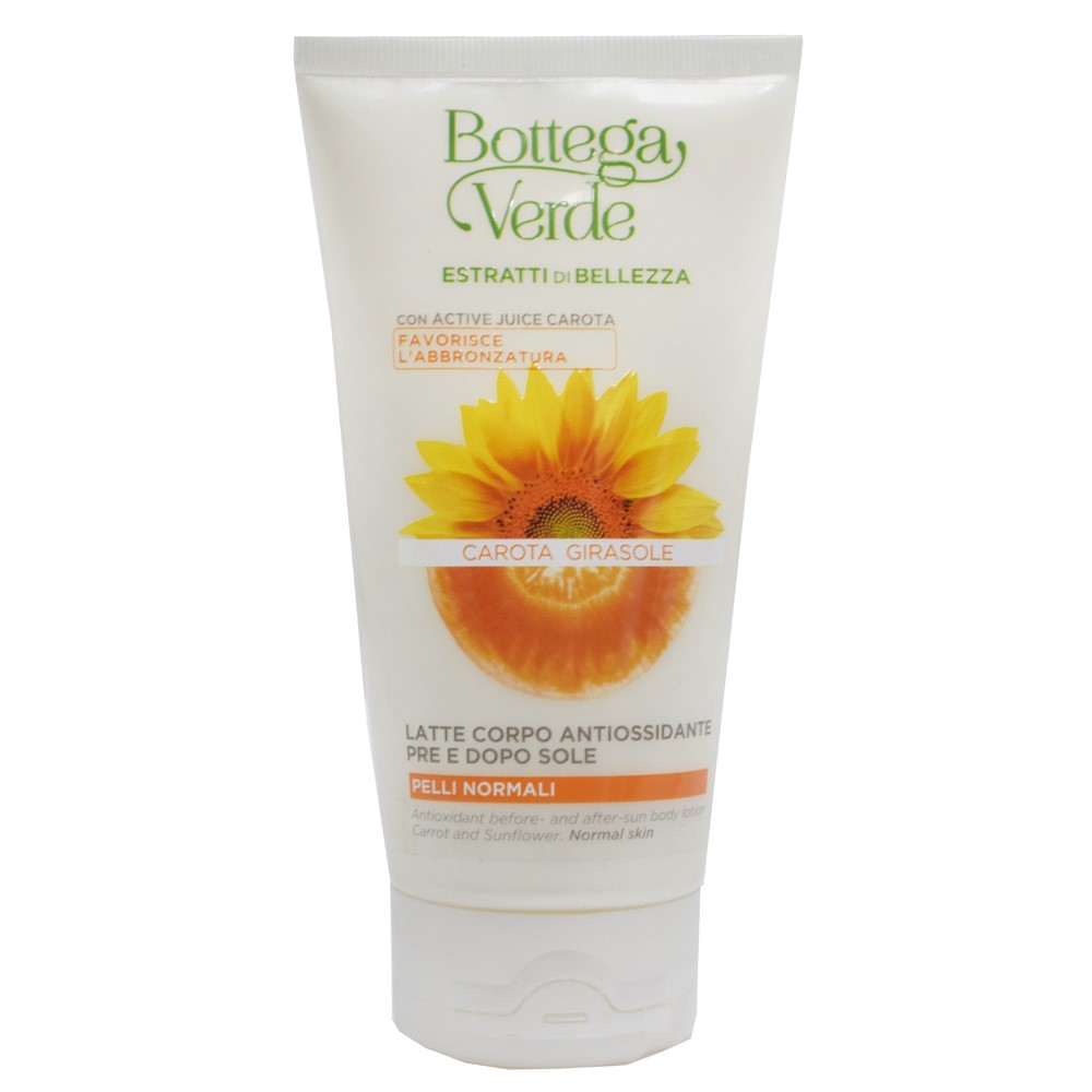 Pre and after sun antioxidant body lotion, with a dermatologically tested hypoallergenic formula, with nourishing properties for the skin. The formula is enriched with carrot extract and sunflower oil, with a high content of vitamin A, E, F and carotene, which eliminates oxidative stress while preventing premature aging of the skin. When used a few weeks before sun exposure, it helps maintain an even tan; applied after exposure to the sun, it prolongs the tanning of the skin, as well as moisturizes and softens the skin at the same time.