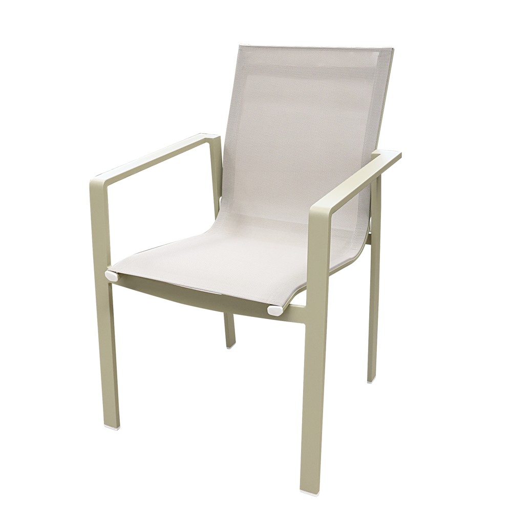 Ndertuar nga struktura solide prej Alumini dhe lyer me ane te procesit "elektrostatik" te lyerjes. Bazamenti dhe pjesa mbeshtetese perbeht prej tekstili rezistent. Perberja kimike e ben ate qendrueshem ndaj degradimit UV dhe agjenteve te atmosferes. Densiteti i larte i copes, mund te perballoje peshe deri ne 120 kg. Karrigja ofron komoditet gjate perdorimit. Mbeshtetesit e kraheve fale formes se drejte dhe siperfaqes se lemuar krijojne rehati. Avantsazhi i te qenurit e stivueshme, e ben edhe me te lehte magazinimin, pasi karriget mund te vendosen njera mbi tjetren. Dizajni i qarte dhe linjat e drejta te strukturave, te kombinuara me formen e tekstilit, demonstrojne stil dhe klas.