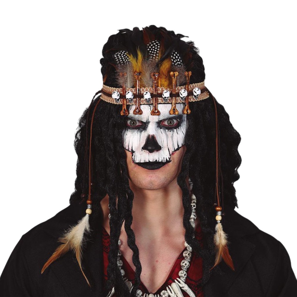 The voodoo feather headband is sure to complete your voodoo costume so you're all ready and scary for Halloween. This voodoo headband is made of polyester with feathers, bones and skulls.
