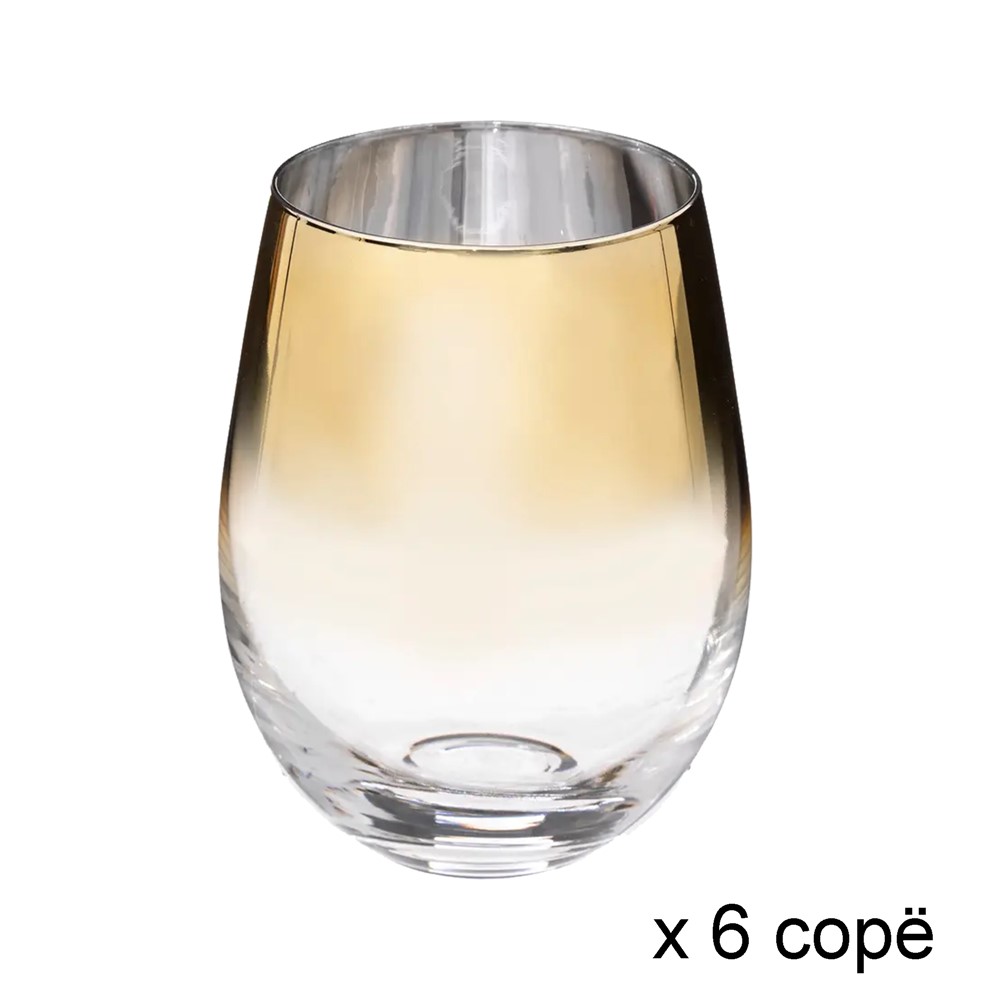 Water glasses with a pack of 6 and a generous volume of 540 ml. The glasses are very fine, with a gold colored top. Good glass material, the glasses are easy to clean and in the dishwasher.