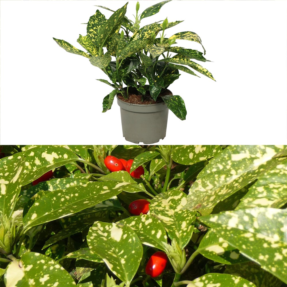 Aucuba japonica is an evergreen plant, with colorful leaves, green and yellow gold. The flowers are not particularly ornamental, but the attractive, bright red berries replace them in the fall if a male plant grows nearby. Flowers and fruits are often hidden behind the leaves.