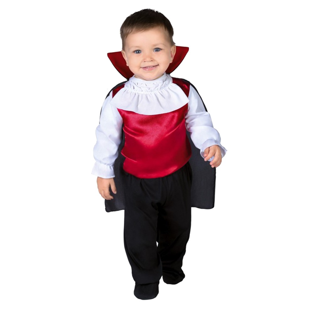Dracula baby suit, made of red and black polyester material. The dress consists of: 1 pants, 1 cape, 1 blouse. Age: 1-2 year