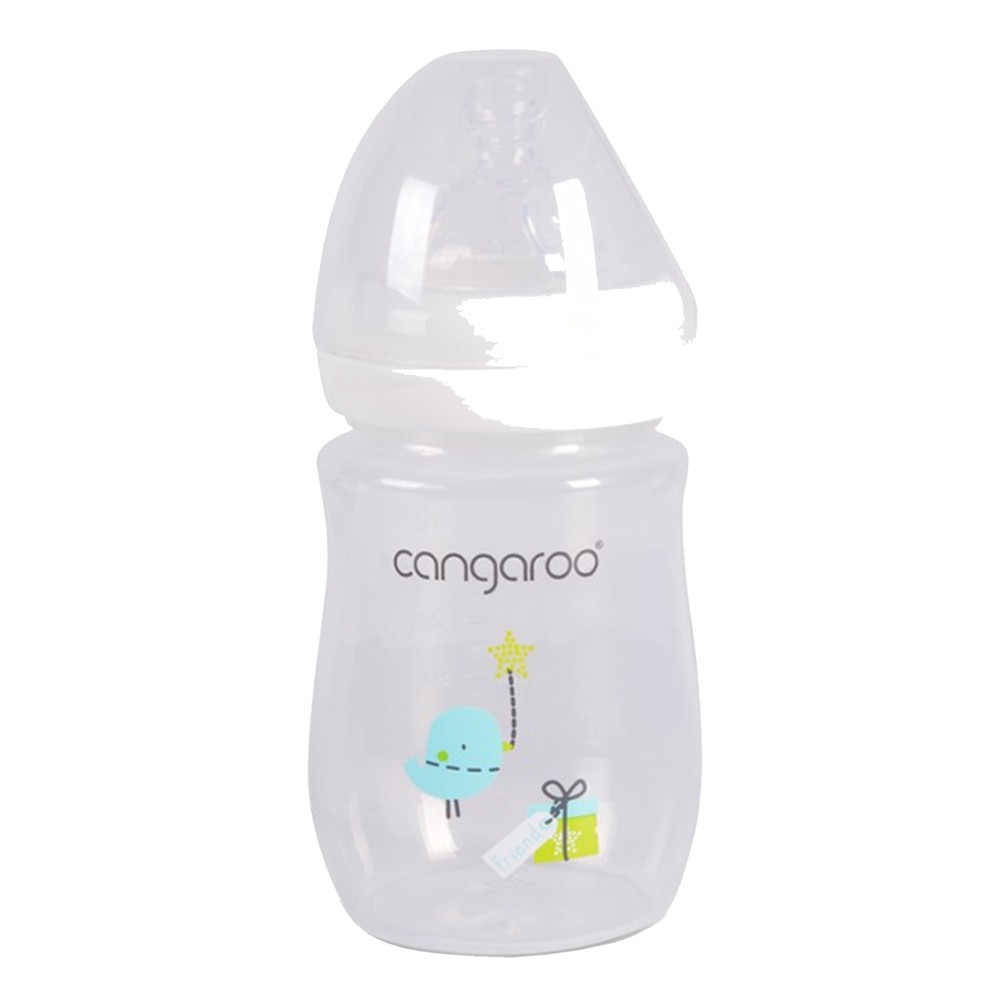 Baby bottle, made of plastic material, without BPA synthetic compounds, with a feeding head made of soft silicone and a protective plastic cap, in transparent color. The feeding head has advanced anti-colic properties that minimize the passage of air during feeding, preventing colic in babies. The bottle has an ergonomic design, which allows it to be easily held and makes it practical to use. This product is suitable for newborn babies.