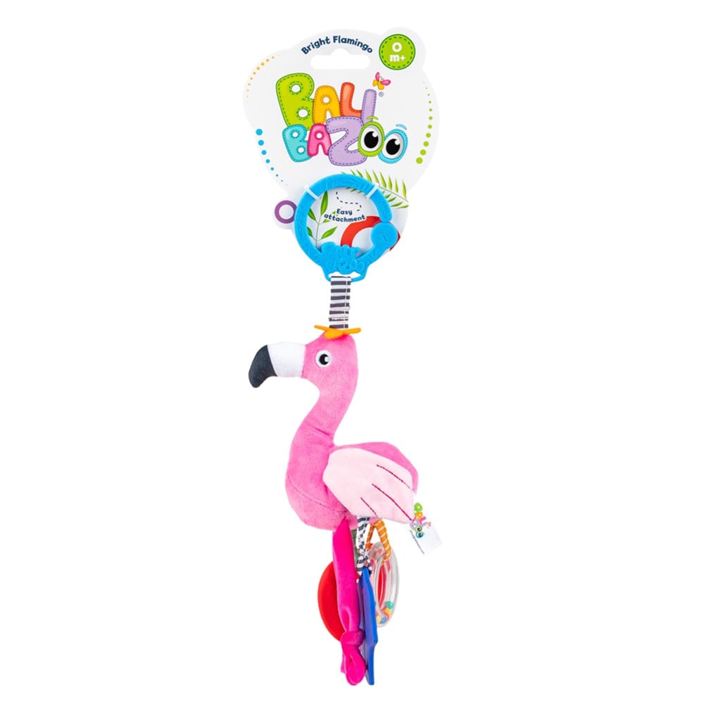 This colorful flamingo brings joy and fun, offering your baby a rich sensory experience. The bird's wings are decorated with two soft, colorful teethers that soothe gums during teething. The toy also includes a rattle ring with colored beads that attract attention and stimulate the sense of hearing. Made of materials with different textures, this toy stimulates tactile sensitivity and encourages baby to explore the world through their senses. Thanks to the practical hanging clip, the flamingo can be attached anywhere, on the stroller, bed, car seat, etc.