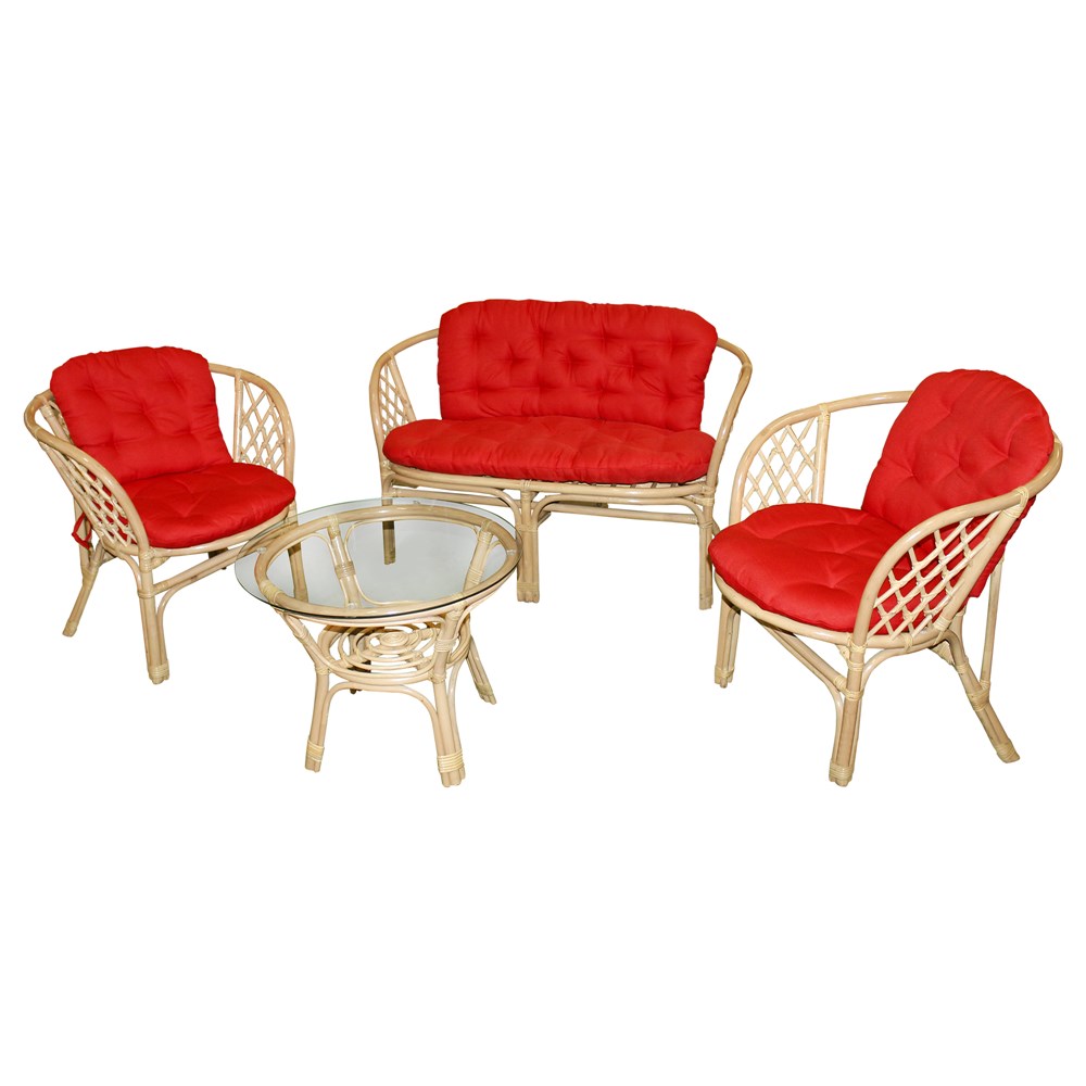 You're reviewing:BAHAMA set (2 Chair + 1 Sofa + 1 Table with glass + 3 Cushion + 3 Pillow), Size: Chair: 66x67x71cm; Sofa: 66x115x71cm; Table: D.55 x45 cm, Color: Set: Dark Brown; Cushion+Pillow: (Red), Material: Set: Rattan; Cushion+Pillow: (Polyester)