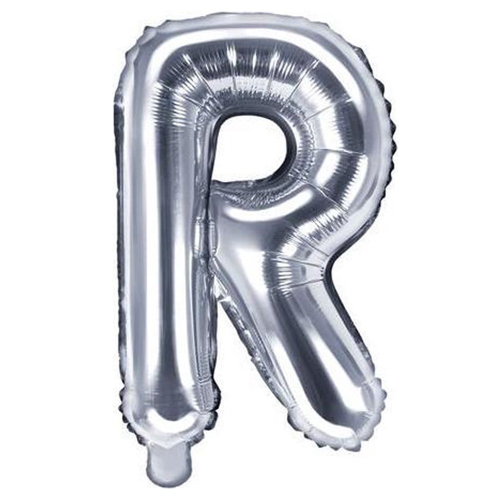 Balloon in the shape of the letter "R", made of nylon material and coated with refined aluminum, in silver color. This product is suitable for creating various decorations for parties and events.