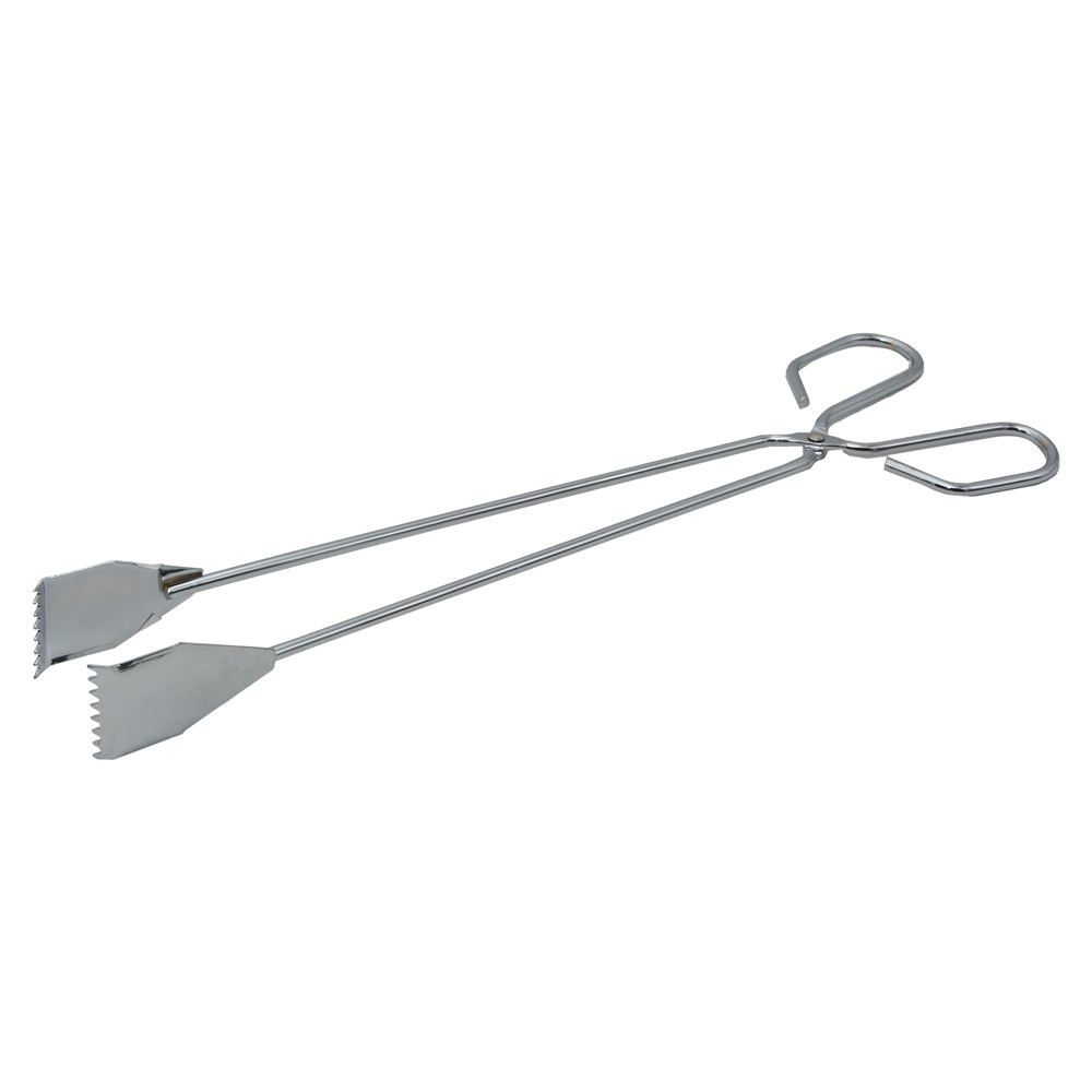 This scissor tongs is made from hard chrome plated steel with the scissor handle wrapped in right plastic rubber for cool-touch handling and secure grip.