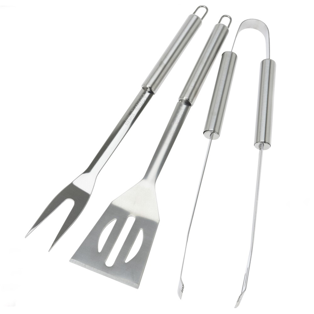Barbecue cooking tools set, made of durable stainless steel material, which includes a fork, with dimensions of 35 cm in length, a pair of tongs, with dimensions of 34 cm in length, and a spatula, with dimensions of 35 cm in length. The tools can be used for roasting meat, fish and various vegetables, on barbecues and grills, while protecting the hands from high temperatures. This product is lightweight and practical to use, can be easily cleaned and it is suitable for use at barbecues, camping, picnics, etc.