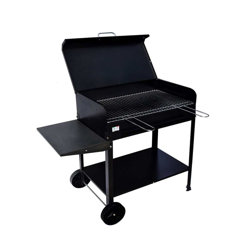 Large barbecue. There are certain places in 3 positions to be able to place the grill at different heights. There is a tray at the bottom for placing cooking accessories. This "Barbecue" is also equipped with wheels, lid and handle. Ideal for cooking all kinds of meat, fish or vegetables.