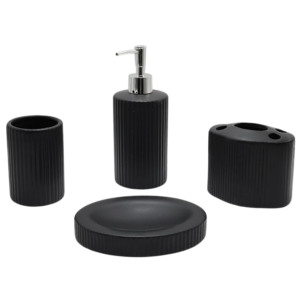 The "Stripes B" furniture support accessory set has a straight line design that gives a minimalist and modern look to your bathroom. Conceived in black ceramic, this set fits easily with all types of furnishings. The set consists of a liquid soap dispenser, a soap holder, a brush holder and a cotton holder.