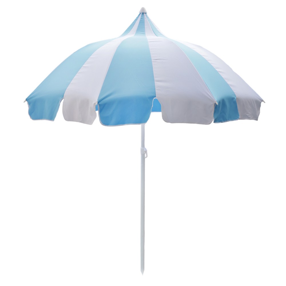 The beach/outdoor umbrella with a metal structure, in light blue and white, is an elegant and practical option for any outdoor space. With a diameter of D1.9 m, this umbrella offers sufficient coverage for small areas such as beaches, balconies, terraces or gardens. The durable and strong metal structure ensures stability and durability. The light blue and white colors give it a refreshing and relaxing look, creating a pleasant and cheerful atmosphere in any environment. This simple and beautiful design is suitable for different weather conditions and offers excellent protection from the sun. The umbrella is easy to assemble and use, providing a comfortable and protected space for outdoor activities. Ideal for use on beaches, home gardens or for any outdoor space.