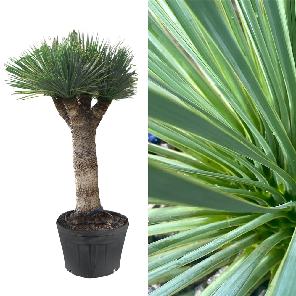 Yucca is an extremely ornamental, slow-growing evergreen plant with a perfectly symmetrical shape. Its form includes hundreds of leaves about 60 cm long. The leaves have sharp points and are an attractive pale blue-green color. The rosette of leaves sits at the top of the trunk and is covered with the remains of old leaves which are soft. Yellow to orange stems appear at the top of the plant in late spring. The stem has clusters of white flowers. This tree-like plant has leaves that are soft, unlike other varieties of yucca. One of the hardiest of trunk-forming yuccas, it tolerates cold -26 to -29 C. While full sun is ideal, it tolerates part shade as long as it gets at least three hours of sun.