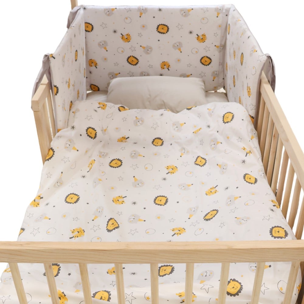This crib sheet set is an excellent choice to create a beautiful and pleasant environment in the child's room. Its design is rich in color, including lion-like elements. The set includes a full variety of bed textiles providing a complete equipment for the child's bed. Suitable for bed code 7810803.