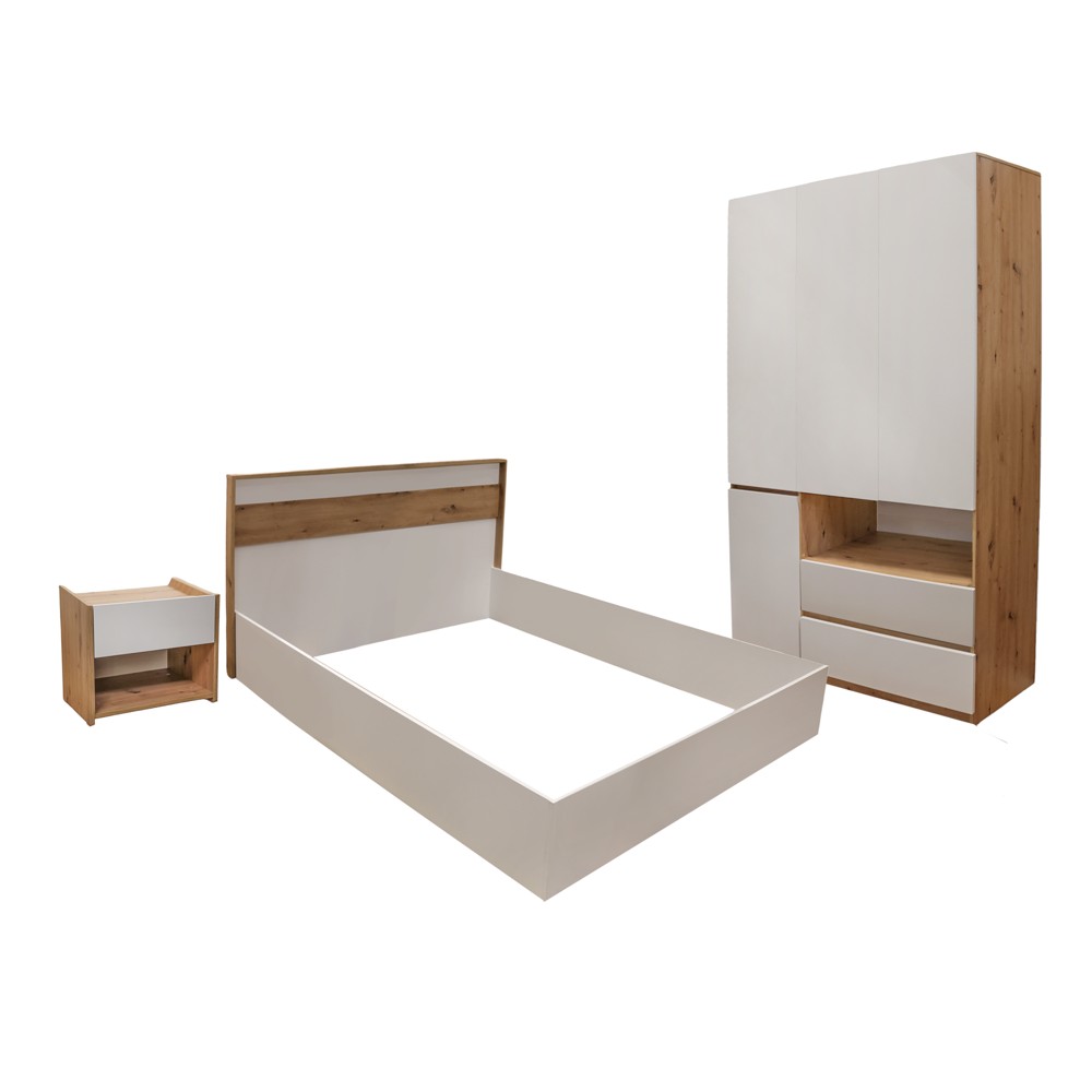 This bedroom set offers an excellent combination of modern styling, functionality and adaptability, creating a wonderful and comfortable environment for relaxation and sleep. The bedroom consists of; 1-Wardrobe with dimensions: 135x52xH205 cm. This wardrobe with its generous dimensions offers enough space for storing and organizing your clothes and clothes. 2-2-piece nightstand: 42x35xH42 cm. Designed with a modern and attractive look with bedroom style. 3- Double bed: 160x200xH92.5 cm. The double bed offers the peace and comfort we all seek after a tiring day at work. Constructed with a durable structure and attractive design to match the style of the Aulona bedroom.