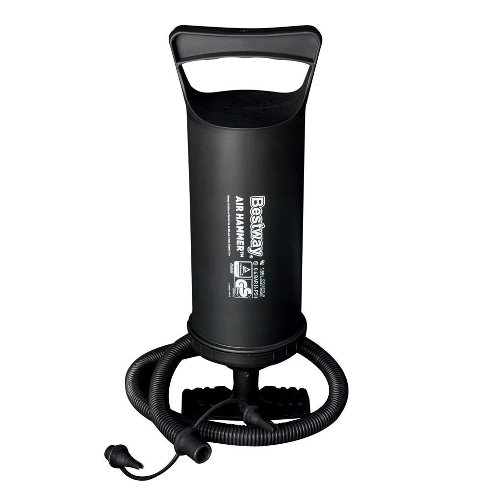 The Bestway® 36 cm Air Hammer™ hand pump inflates swim rings, air mattresses, inflatable boats, toys and other inflatable objects in no time. Above all, it convinces with a maximum and continuous air flow - both when pumping up and when pumping down. The pump is made of robust material and also has three different universal adapters.