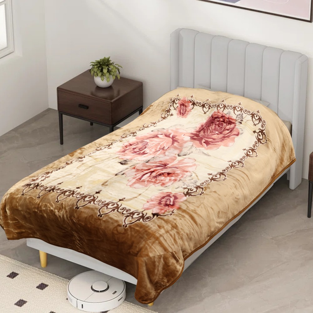 Blanket, Raschel, single, polyester, brown with flowers, 160x220 cm