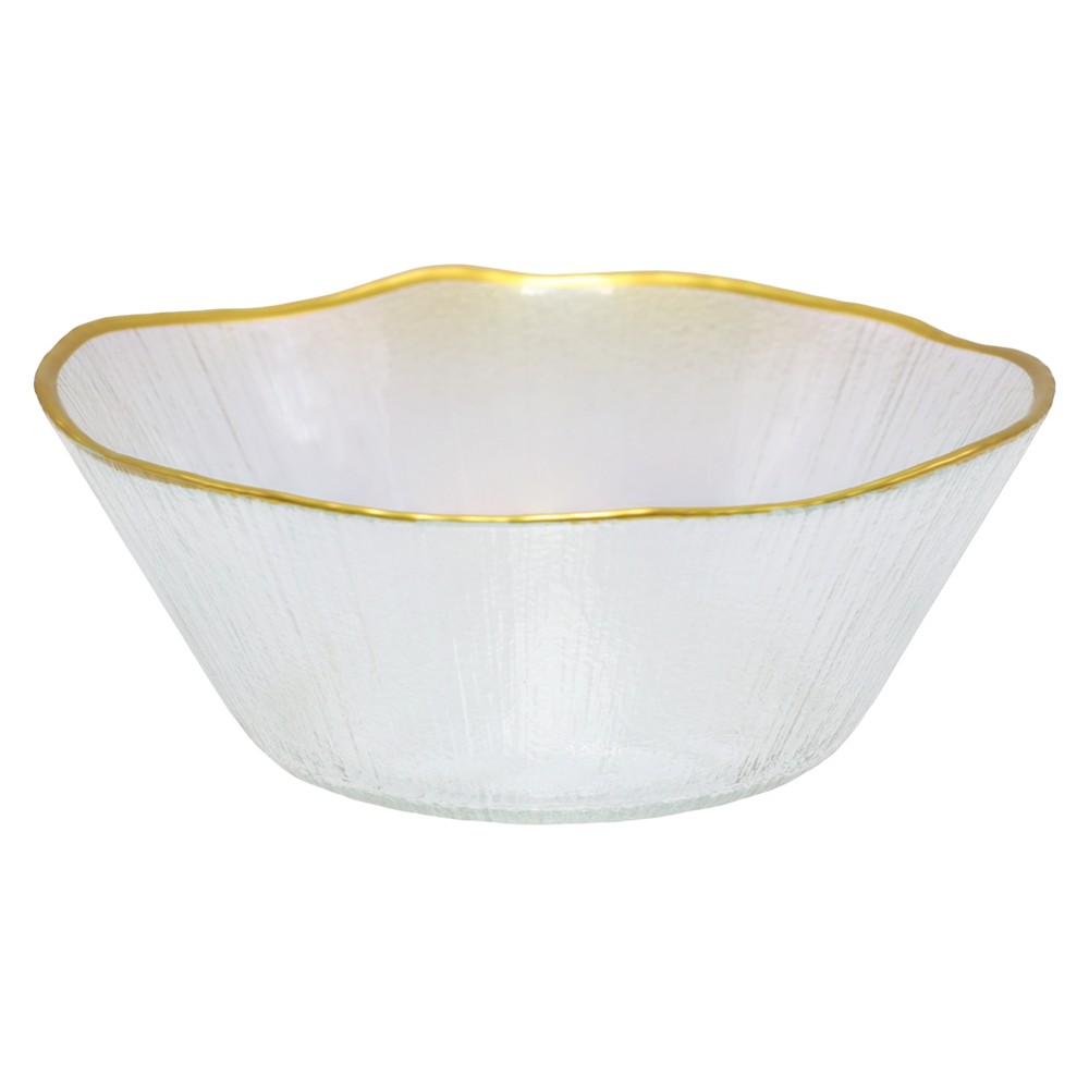 This glass is an elegant and refined object, featuring a distinctive design that combines the transparency of glass with a golden contour, making it stand out. The glass has a height of 5.5 cm and a diameter of 15 cm at the top, making it suitable for decorative use in various settings such as tables, display cases, or reception areas. The golden contour gives it a luxurious and sophisticated look, making it a perfect addition to any space that calls for an air of elegance and class. This glass is ideal for any occasion, making it an excellent choice both as a gift and for personal decor.