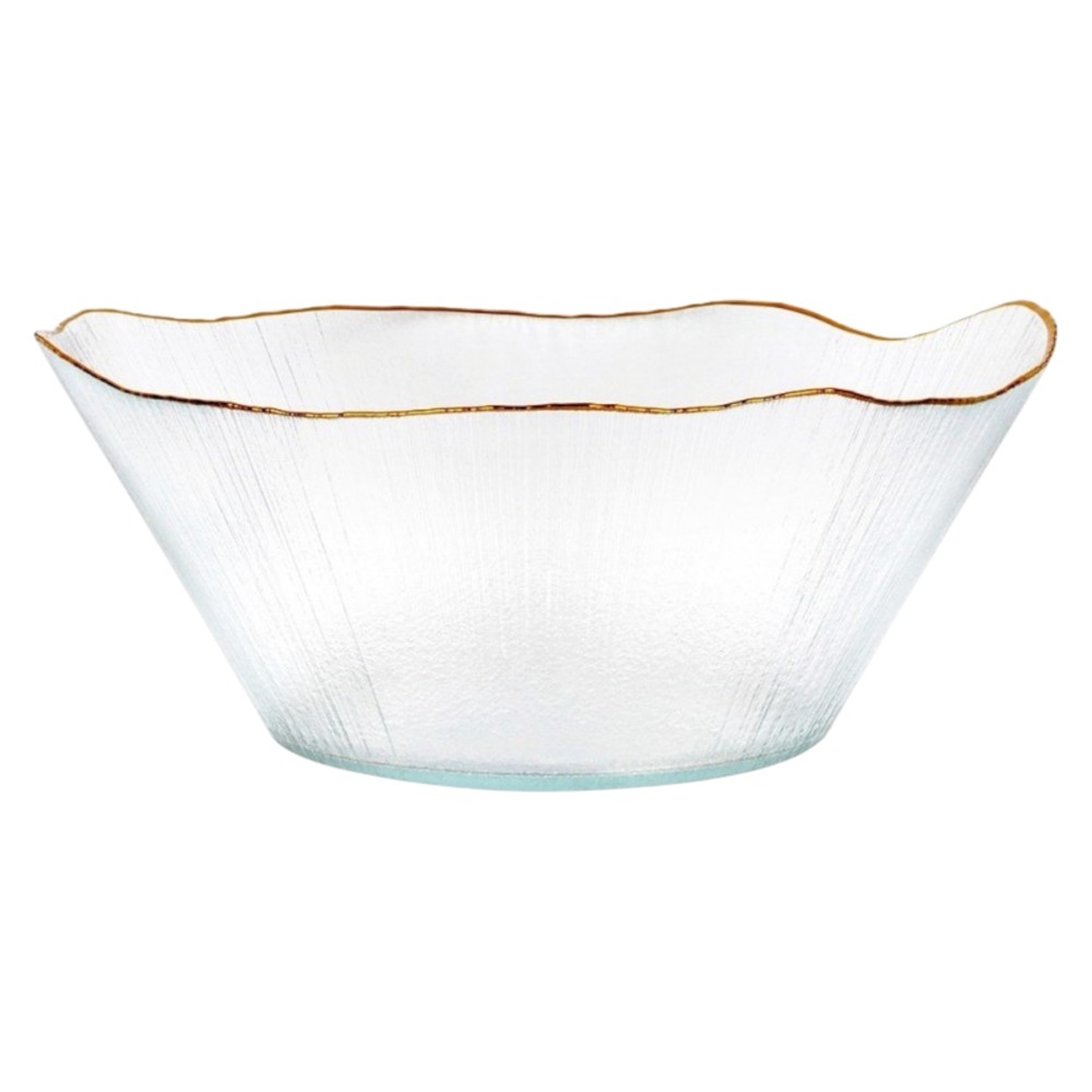 Bowl made of transparent glass with a gold rim, measuring Dia. 28 x H 11 cm. This elegant bowl is ideal for serving soups, salads, desserts, or larger dishes with style. The clear glass allows the presentation of food to be fully appreciated, while the gold rim adds a touch of luxury and sophistication. Durable and easy to clean, this bowl combines practicality with a refined design, making it perfect for both everyday use and special occasions.