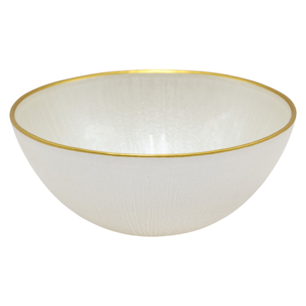 Bowl made of white glass with a gold rim, measuring Dia. 15 cm, is an elegant and versatile accessory for serving soups, salads, desserts, or other dishes. The white glass offers a clean and sophisticated look, while the gold rim adds a touch of luxury and refinement. Durable and easy to clean, this bowl combines practicality with a stylish design, making it ideal for both everyday use and special occasions.
