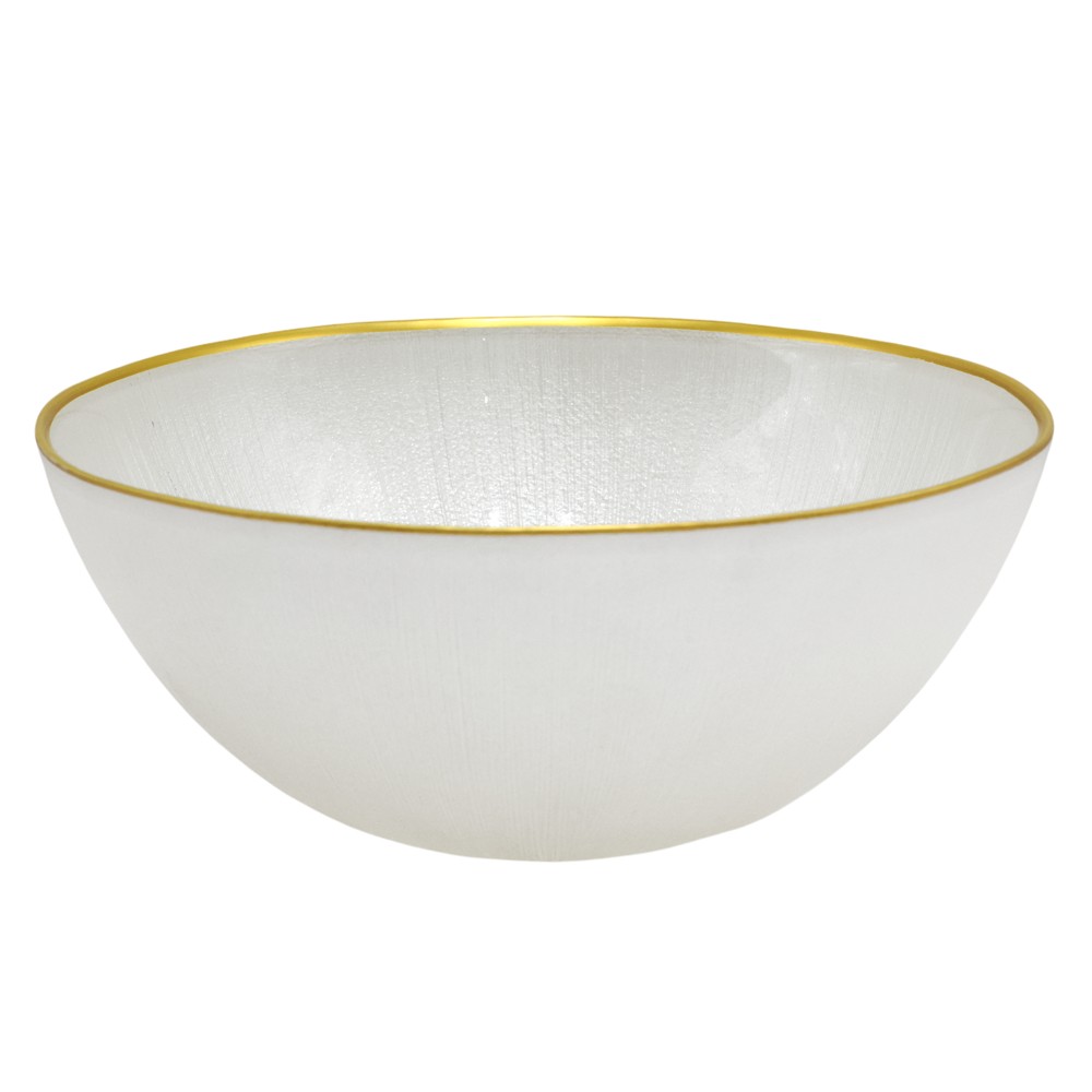 Bowl made of white glass with a gold rim, measuring Dia. 21 cm. This elegant bowl is perfect for serving soups, salads, desserts, or other dishes with style. The white glass provides a clean and sophisticated look, while the gold rim adds a touch of luxury and refinement. Durable and easy to clean, this bowl combines practicality with a refined design, making it ideal for both everyday use and special occasions.