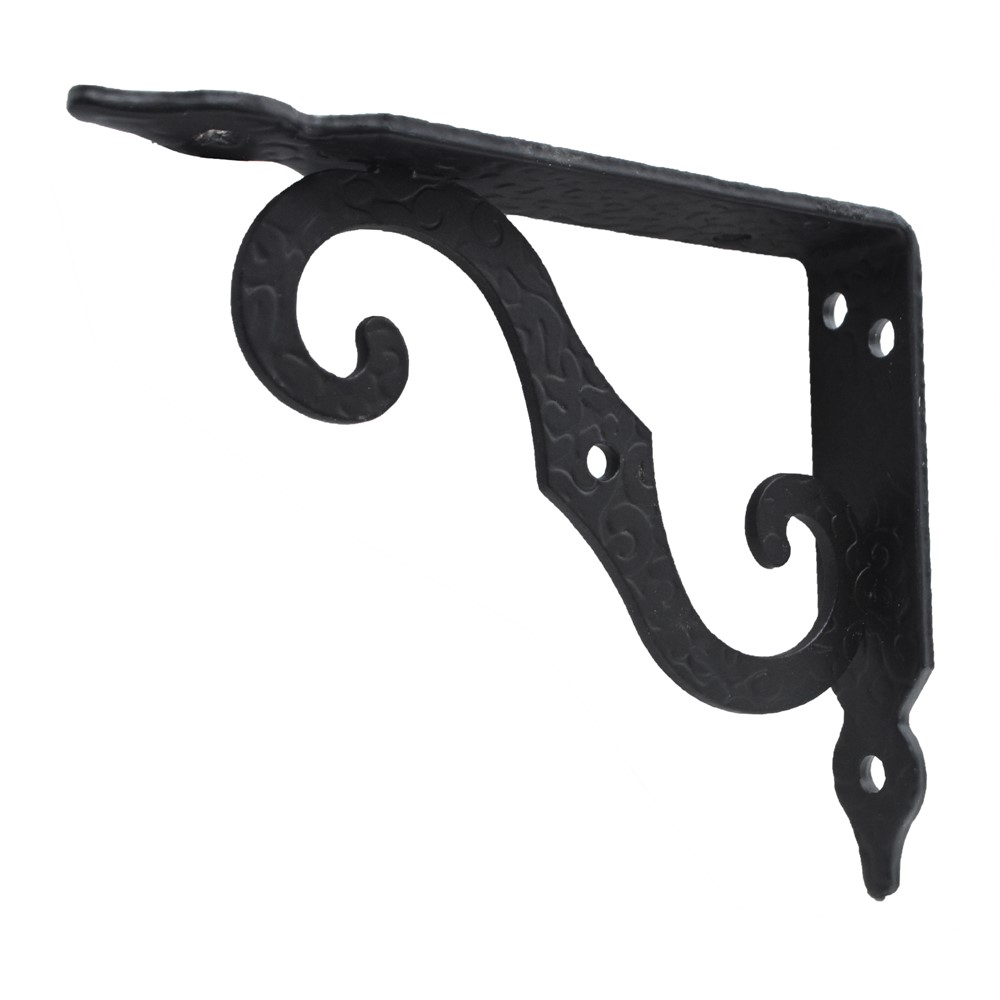 Ornamented shelf bracket, made of sturdy steel material, in black color, with dimensions of 10x7.5 cm, which serves as a decorative and functional accessory for various environments. The constituent material is resistant to use, heavy weights, rust or abrasion. It is used for wall mounting of self-supporting shelves, but it can also find other applications in professional and non-professional environments.