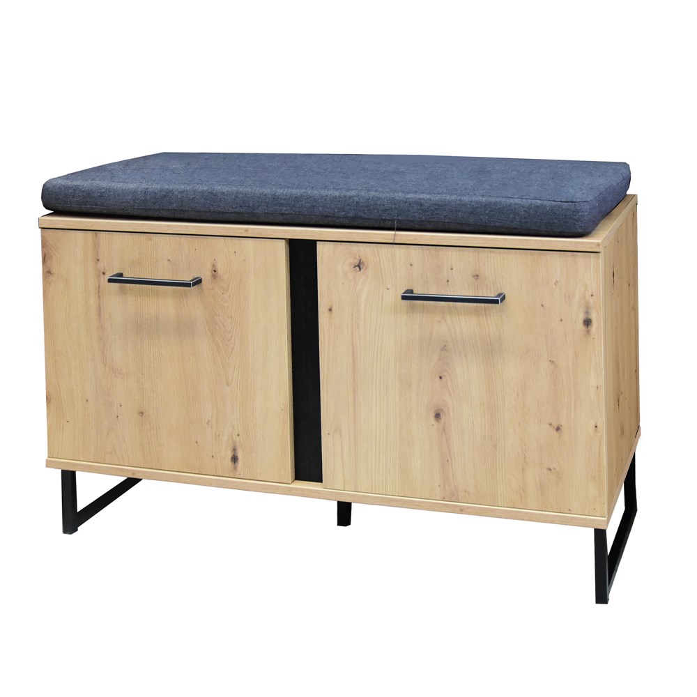 Hall unit element SARDINIA KOM, is a combination of the warmth of natural and rustic artisan oak with admixtures of subtle black elements of decor, as characteristics of industrial style in interior design. It has a practical two-segment closed part for storing shoes and a cushion for the sitting part in a gray pattern. It can be combined with other elements of the SARDINIA hall collection that complete the interior story of the entrance to your home.