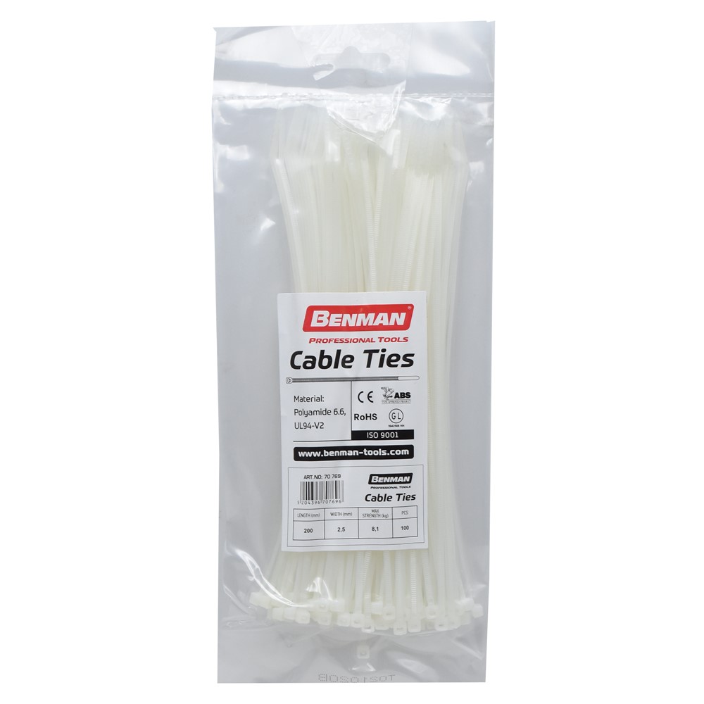 CABLE TIES, WHITE, BENMAN, 200mmX2,5mm (100pcs)