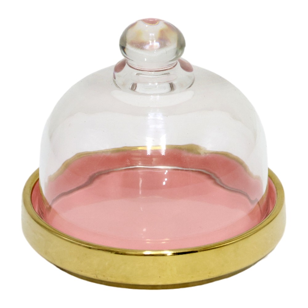 Special cake holder, made of glass and metal in transparent color with gold, 9 cm in diameter. This product offers an attractive presentation for your favorite cake and sweets.
