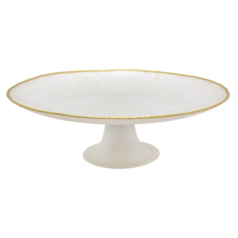 This cake/stand plate is an elegant and practical accessory, made from white glass with a golden contour that gives it a luxurious and refined appearance. With a diameter of 28 cm, this stand is perfect for serving cakes, tarts, or other desserts at special events like weddings, parties, or gatherings. The golden contour adds an air of elegance and sophistication, making every dessert look even more beautiful and special. The stand is an excellent choice for those looking to display their treats with a touch of class and charm.