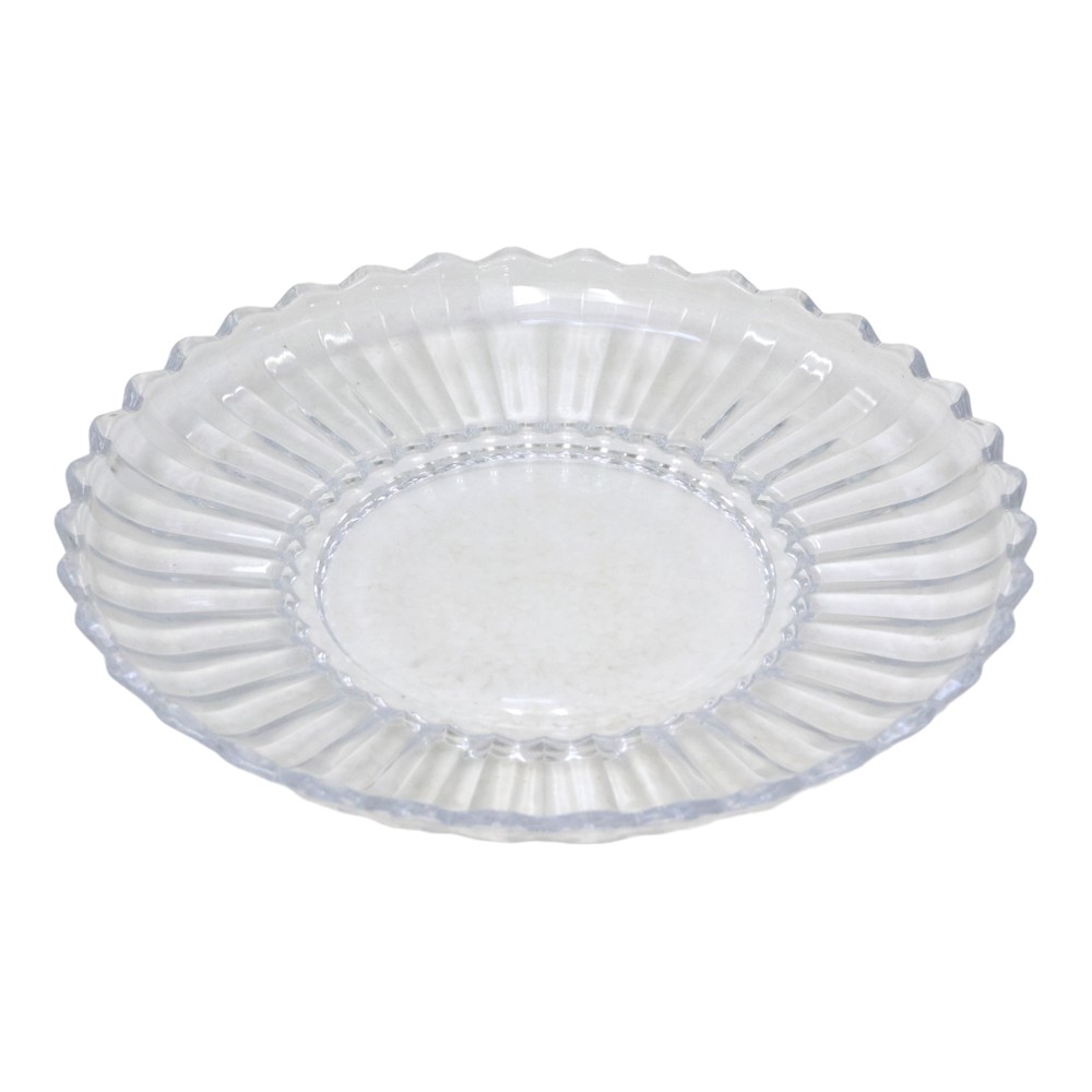 Bonbon or fruit of transparent glass with diameter 29.5 cm and 3.5 cm high. This product is an elegant addition to the décor of your home or to serve fruits and cakes.