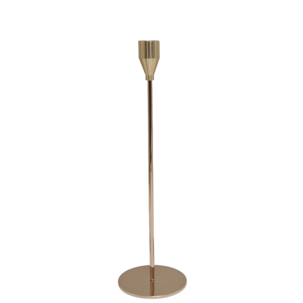 This gold-colored metal candle holder, available in a height of 27 cm, is a decorative accessory with a modern and minimalist style that brings a warm and sophisticated atmosphere to any environment. With clean lines and a matte or light glossy finish, this holder embraces a simple yet effective aesthetic, becoming an elegant visual point in the space where it is placed. The gold color emphasizes elegance, making it easy to combine with different colors and textures in the decor. The metal structure ensures durability and longevity, while the tall design makes it suitable for tall candles, which create a vertical lighting that adds depth and warmth to the environment. Thanks to the different sizes, these holders can be used separately or as a set to create interesting visual levels on the table, on a console, above a fireplace or as decoration in a corner of the room. They are perfect for modern or classic interiors, as well as an excellent choice for events, dinners or party decor.