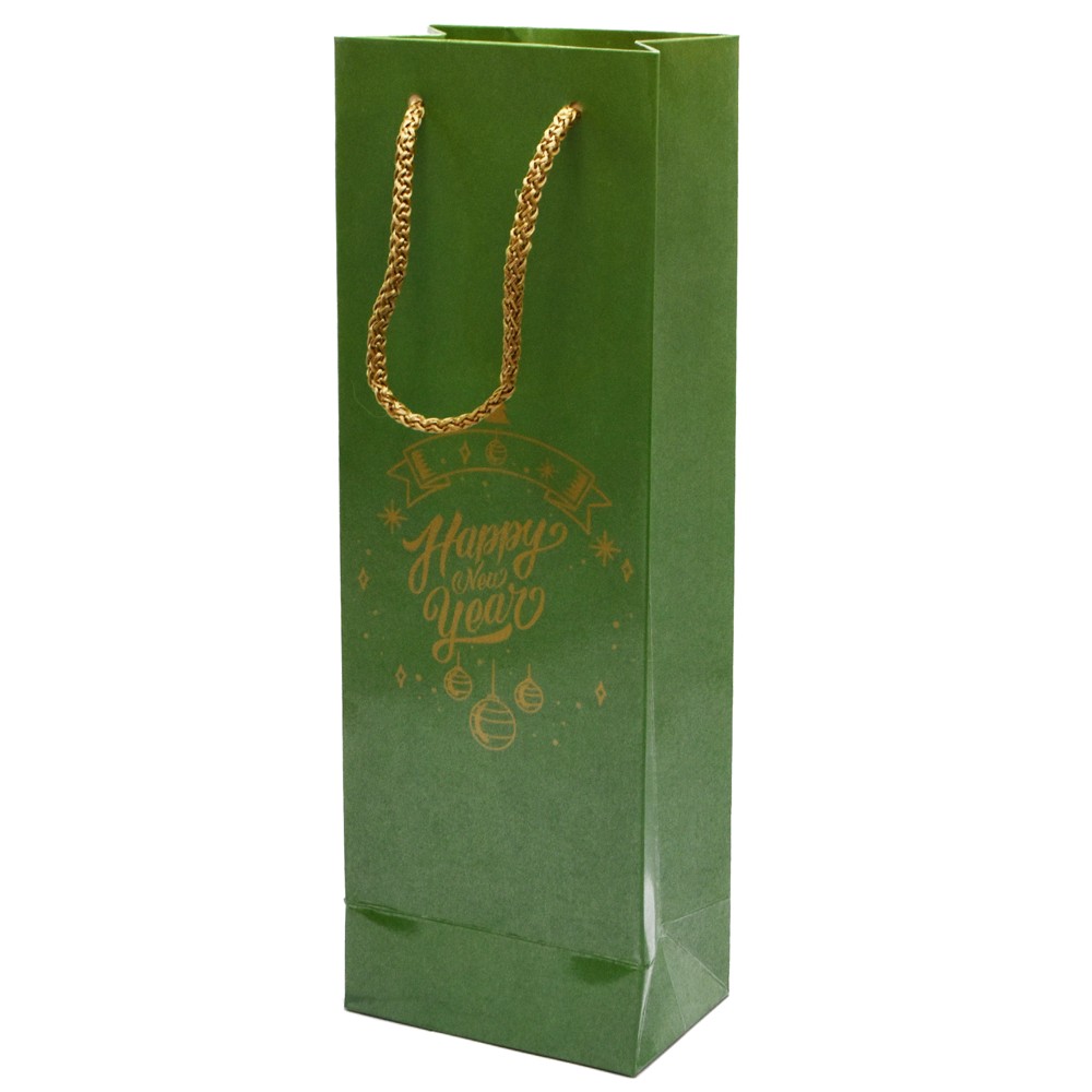 Wine bag made of cardboard material in size 12cm x 35cm x8cm in green color Happy New Year. Suitable for holding wine bottles.