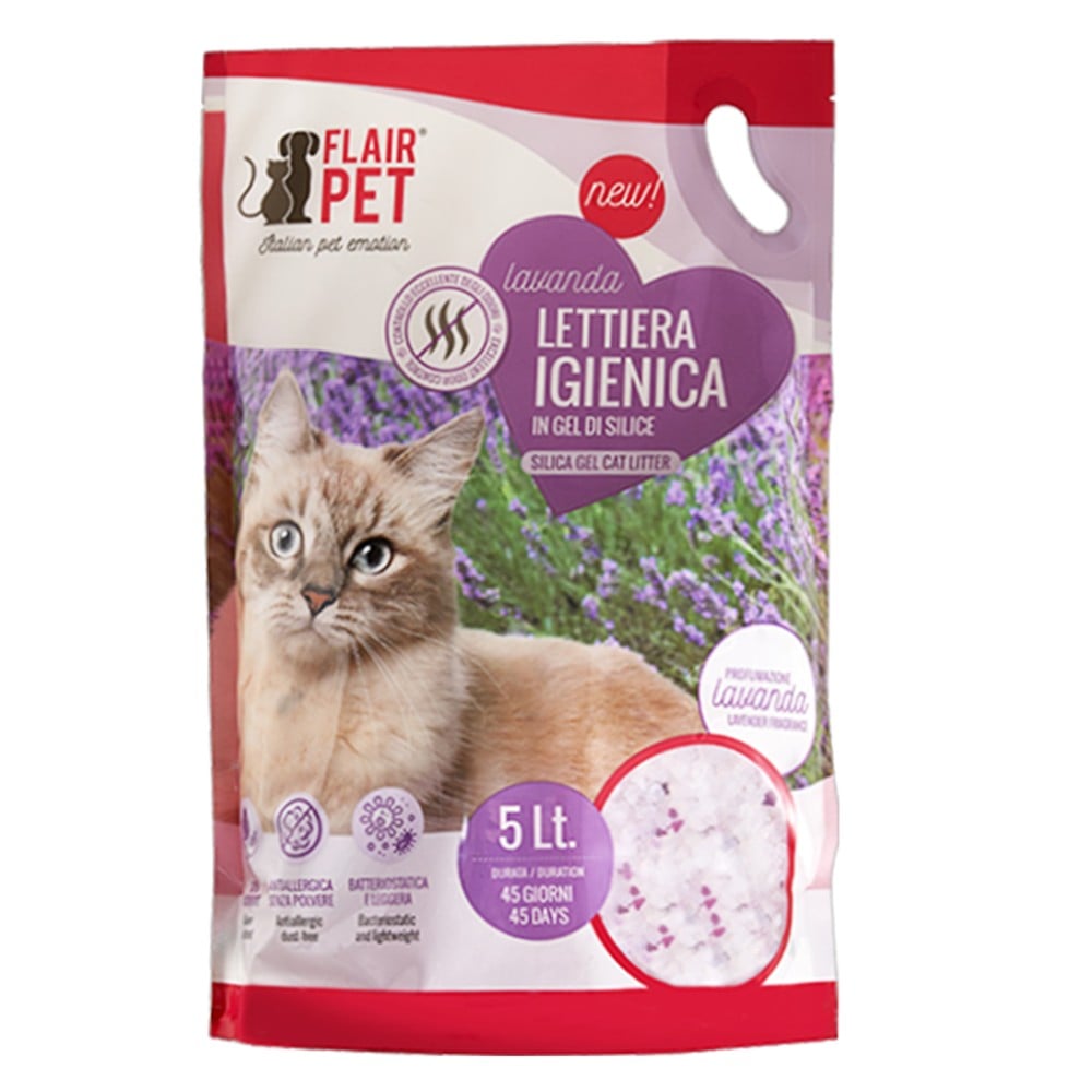 Flair Pet cat litter, 5 L, silica, lavender scented is a premium solution for daily cat litter hygiene, combining the power of silicate crystals with a pleasant relaxing scent. Silicate is a very high-quality material thanks to its porous structure, which quickly absorbs urine and moisture, neutralizing unpleasant odors and preventing the development of bacteria. Compared to traditional litter, silica litter has a much greater absorption capacity, does not produce dust and stays clean for longer, requiring less frequent replacement. The lavender scent gives the litter a fresh and clean feeling, without being heavy for the cat, making this product suitable for both family environments and cats sensitive to other artificial scents.