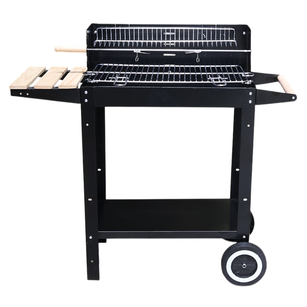 This charcoal barbecue is the perfect choice for those looking for a practical and easy-to-use BBQ for any outdoor environment. With a simple but functional design, it offers convenience and excellent results in any grilling. With compact and practical dimensions to place on verandas, balconies or small patios. The cooking grill measures 46 x 26 cm, chrome-plated for even heat distribution and easy cleaning. It has a wooden side table, practical for placing dishes, spices and accessories while cooking, offering maximum organization. It has an included skewer rod for traditional dishes such as shish kebab.