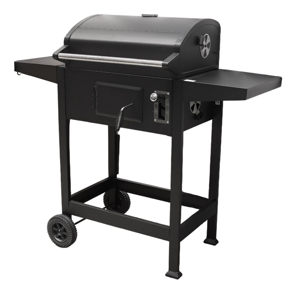 Black metal charcoal barbecue in a safe classic design and a wide range of functions. This charcoal barbecue has a large grilling surface, so you can prepare enough food for your whole family or friends. A separate warm shelf prevents food that is not yet ready to be served from getting cold, without the need to continue cooking it on the barbecue. The highlight of this barbecue is the 3-level height adjustment of the charcoal plate. This allows for easy and convenient adjustment of the distance of the coal to the grate and the intensity of the heat. This allows the temperature to be regulated ideally, without having to add too much or too little coal to the grill. The charcoal plate can be loaded through a door on the front of the grill, allowing for the addition of charcoal or different types of aromatic wood. Side shelves provide a convenient way to store dishes, accessories, etc. Storage options are also expanded with a large end shelf. It also has a closed fire chamber with a capacity of about 2 kg of coal, which protects the coal well from wind or draft and therefore does not emit any splinters or sparks.