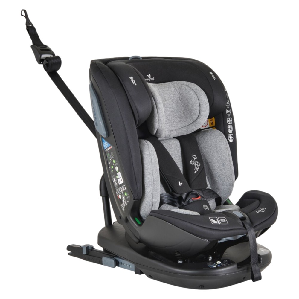 Gravity I-Size car seat 40-150 cm, with Isofix + Top Tether system. Suitable from 0m+ to 150 cm or up to approximately 12 years. This seat has a 5-point safety harness with soft anti-slip shoulder pads. SPS – Side Protection System which provides additional safety. The headrest has added memory foam. 360 degree seat rotation and 4 support positions. Extra soft, anatomical padding for newborns made of 100% organic cotton with added memory foam. The head and shoulder padding are also made of 100% cotton.