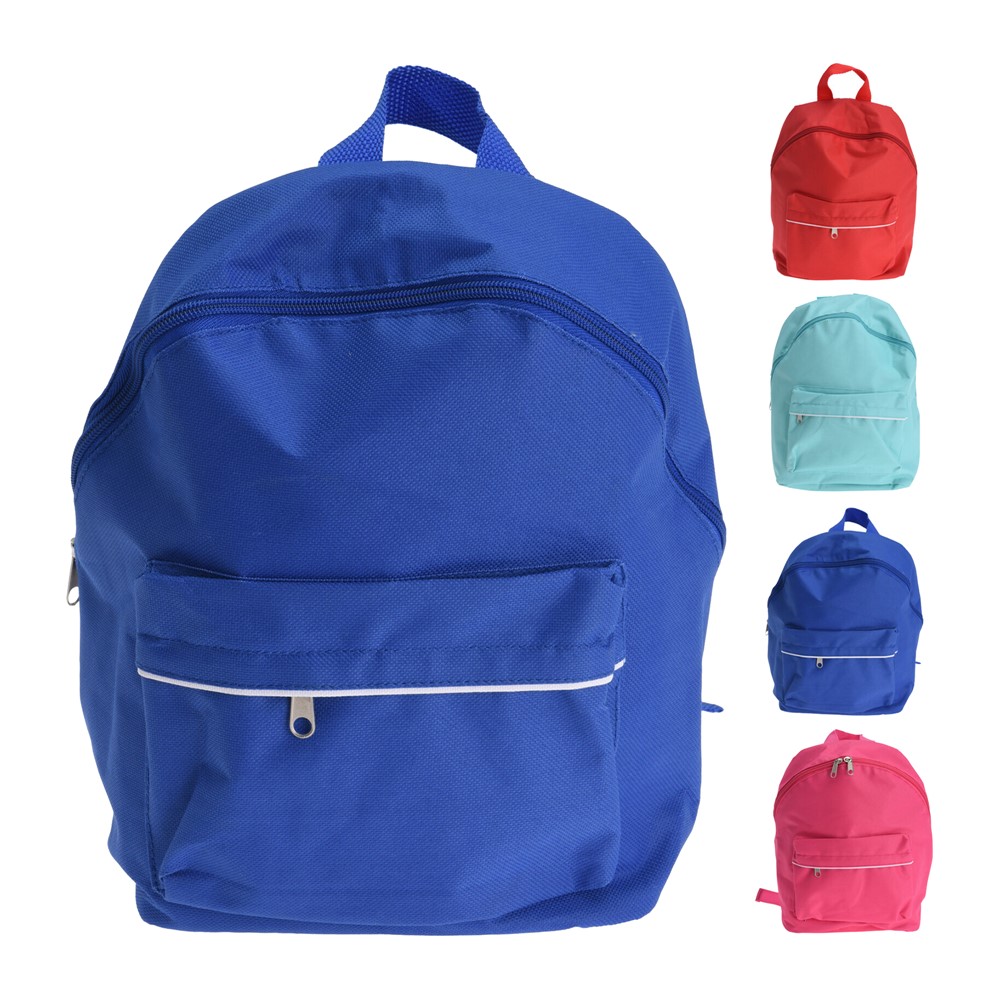 Children's backpack, made of durable polyester material, in different colors and print designs. The bag is equipped with a large compartment with zipper and a small outer pocket, it has a carrying handle and shoulder straps of adjustable length, with soft foam filling, which make it easy to hold by children. It can be used for carrying notebooks, books and school accessories, as well as carrying toys, food and various drinks. This product is suitable for use by children over 3 years old.