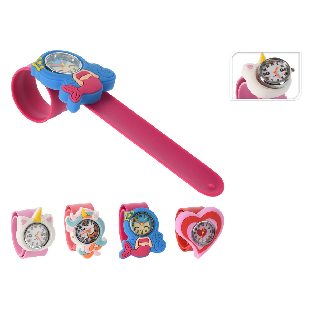 Children's watch bracelet made of plastic material with different designs.