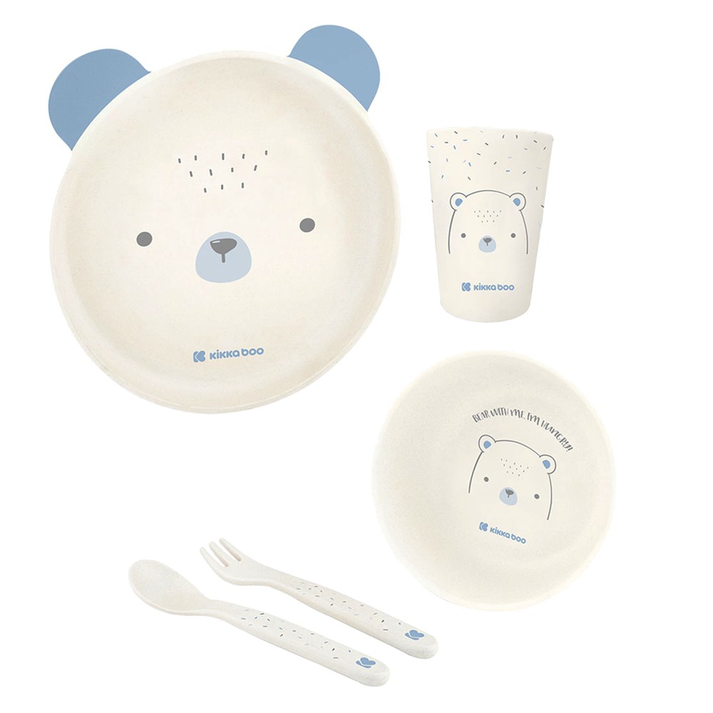 Baby food set, with bear design, in white and blue. The set contains a plate for placing food, a bowl, a glass of water, a spoon and a fork. It is used by children at home, picnic or other activities. This product is practical to use and easy to clean.