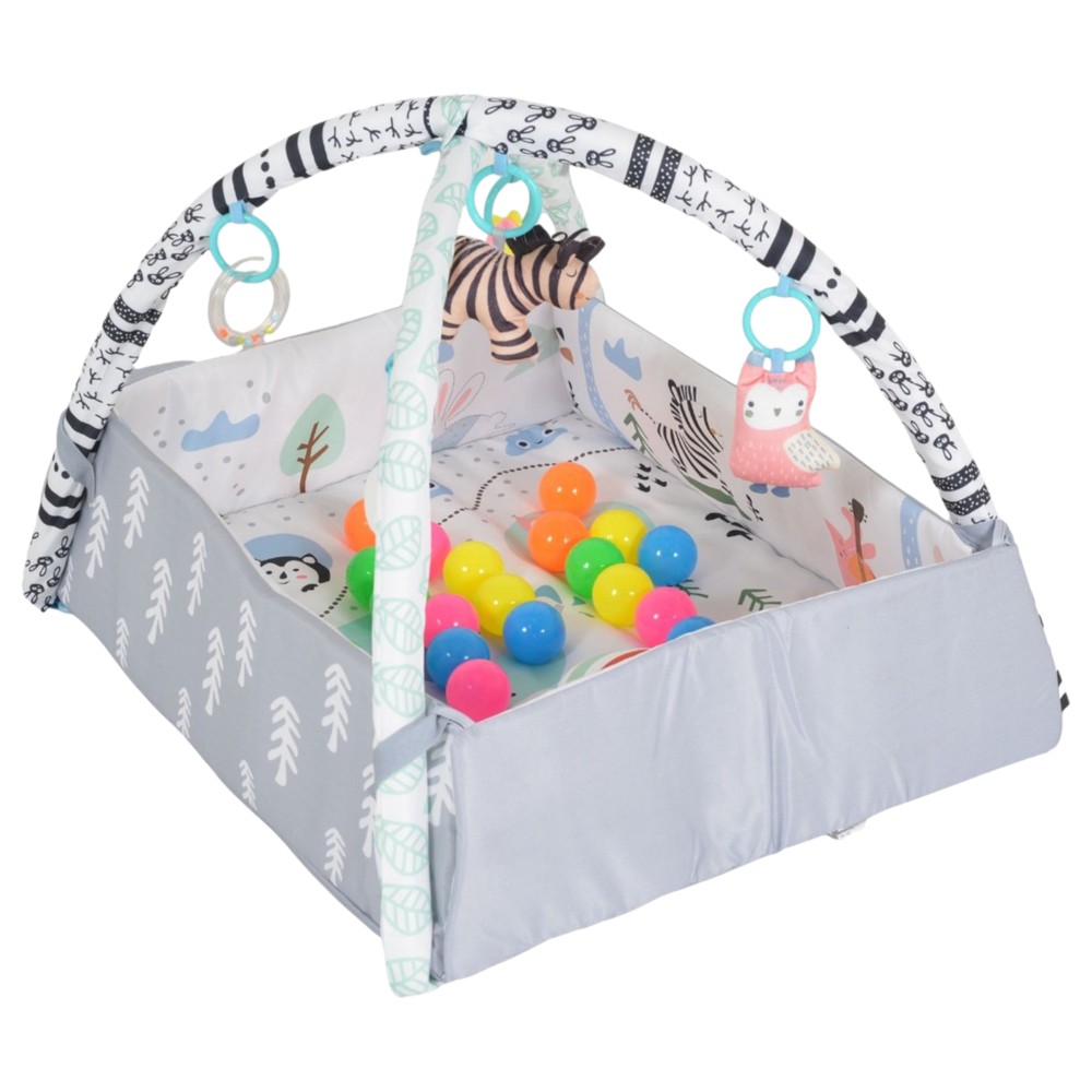 Happy Space is a multifunctional activity gym, designed to provide fun and development for the child. It offers 3 play positions, on the back, on the stomach and sitting, adapting to the different needs of the baby as it grows. The set includes several soft toys, 20 play balls, a comfortable pillow, as well as removable play arches, which can be placed or removed depending on the activity. All materials are non-toxic, safe for children's health. The play gym has the function of closing 4 sides, creating a protected and comfortable environment for play. It stimulates the development of the child's intelligence, hand and foot mobility, and helps in recognizing different shapes and colors.
