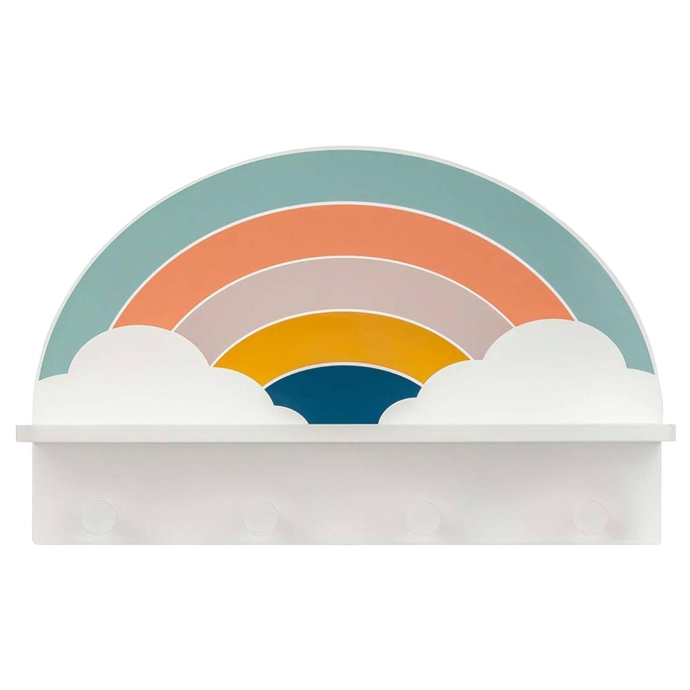 Rainbow-shaped clothes hanger for children's rooms. Made of MDF material, in different colors, measuring 49x30x12 cm. This hanger has 4 hooks for hanging clothes. Ideal for the bedroom, but also for schools or kindergartens.