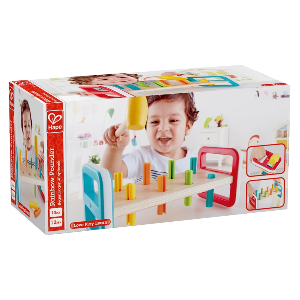 Rainbow colored wooden toy from Hape. Includes wooden bench, eight pins in four different colors and a wooden mallet with a soft plastic head. Soft plastic rings on its legs keep the bench from sliding while hammering. Great for teaching kids colors and numbers.