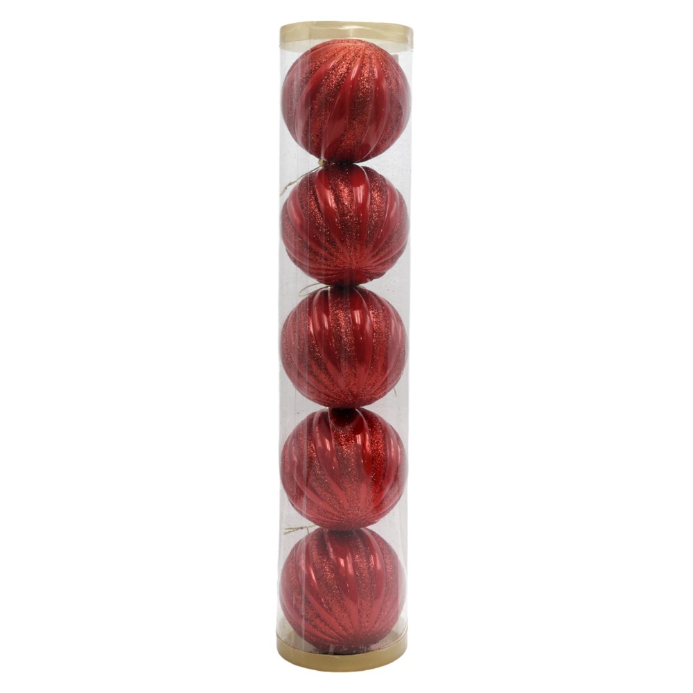 Christmas baubles (pk 5), plastic, red & glitter, 10 cm
