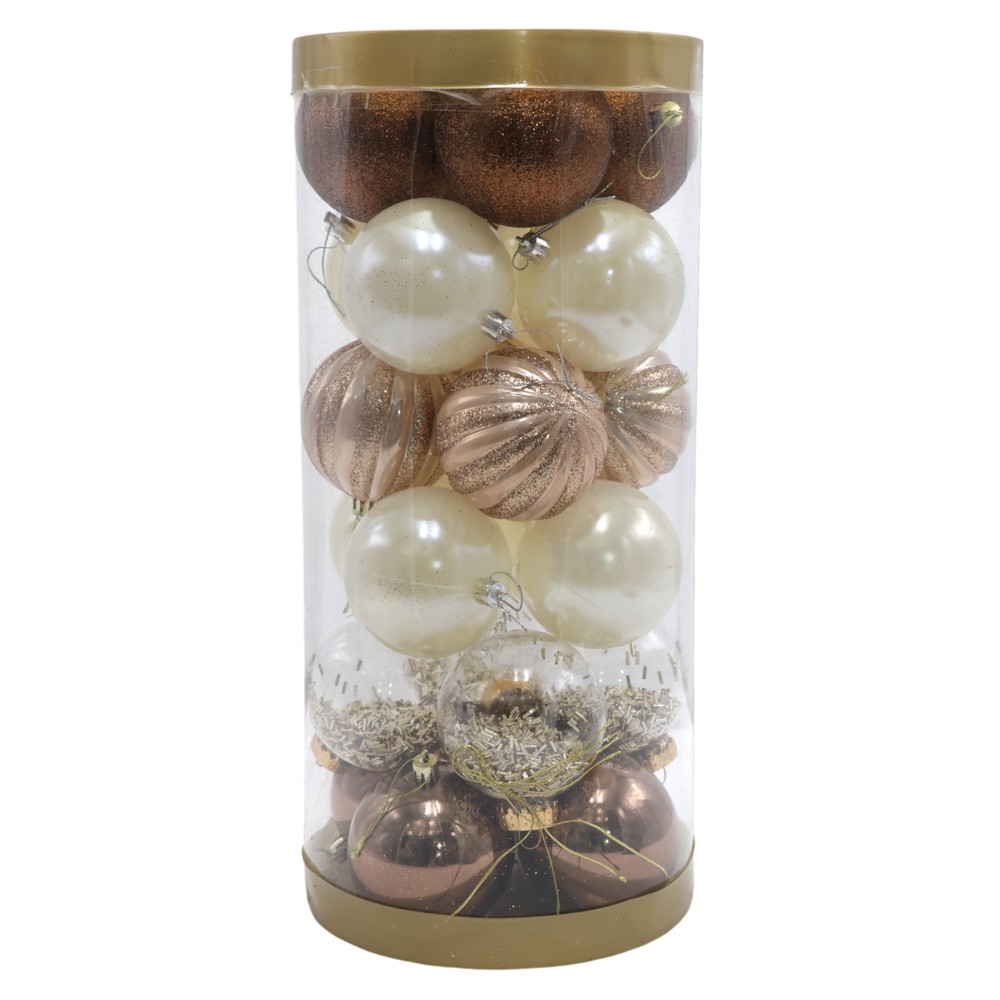 Christmas baubless (pk 24), plastic, white, brown, champagne, 6 models, 8 cm