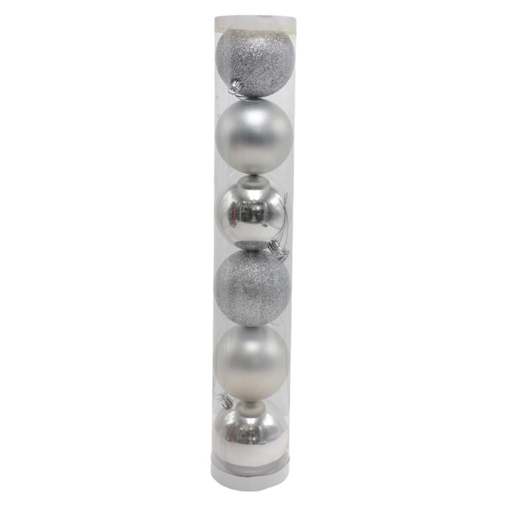 Christmas baubless (pk 6), plastic, silver, 3 models, 8 cm